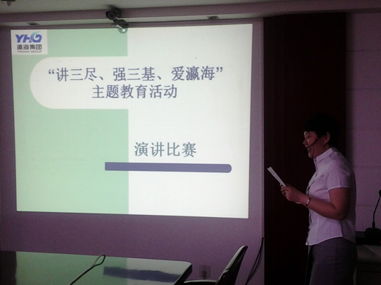 2012年5月30日,集團(tuán)總裁辦在總部會議室組織全員開展“講三盡、強(qiáng)三基、愛瀛?!毖葜v賽活動,集團(tuán)機(jī)關(guān)共10位代表選手參加了此次演講賽。集團(tuán)常務(wù)副總裁陳琴、運(yùn)行管理部部長倪宏山、銷售公司經(jīng)理馬君、人力資源部部長馬麗霞、投資發(fā)展部經(jīng)理樓高峰及總裁辦主任王華擔(dān)任此次比賽的評委,總裁辦古玲芝主持整場比賽。